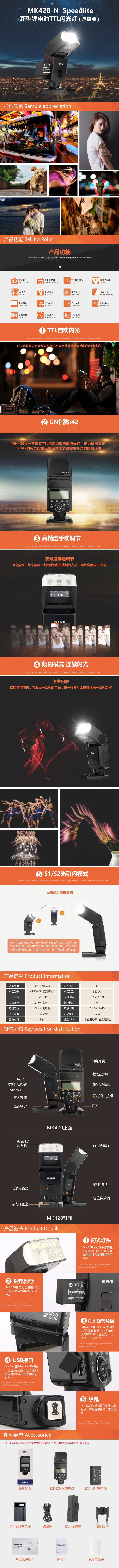 ◆ 新款MK420采用高能的鋰電池穩(wěn)定供電,GN42的閃光輸出指數(shù)可應(yīng)付多種攝影補光場合。燈頭可以多角度調(diào)整以適應(yīng)不同的場合使用需要,除了帶有TTL外,還有離機S1/S2引閃、手動模式、頻閃模式,還配有LED燈,可以在輔助對焦或者拍視頻。